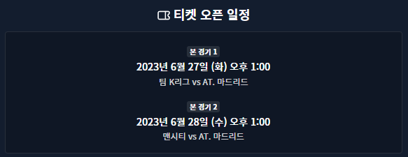 맨시티와 AT마드리드 티켓 예매 오픈 일정은 6월 28일(수) 오후 1시 부터 입니다. 일정 확인하셔서 미리 예매 준비하면 좋겠습니다. 팀리그와 AT마드리드의 티켓 오픈은 6월 27일(화) 오후 1시 입니다.
