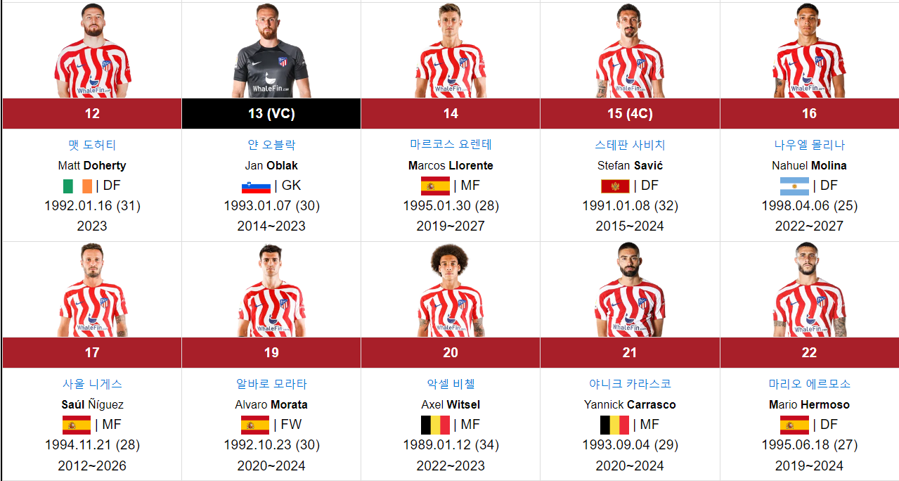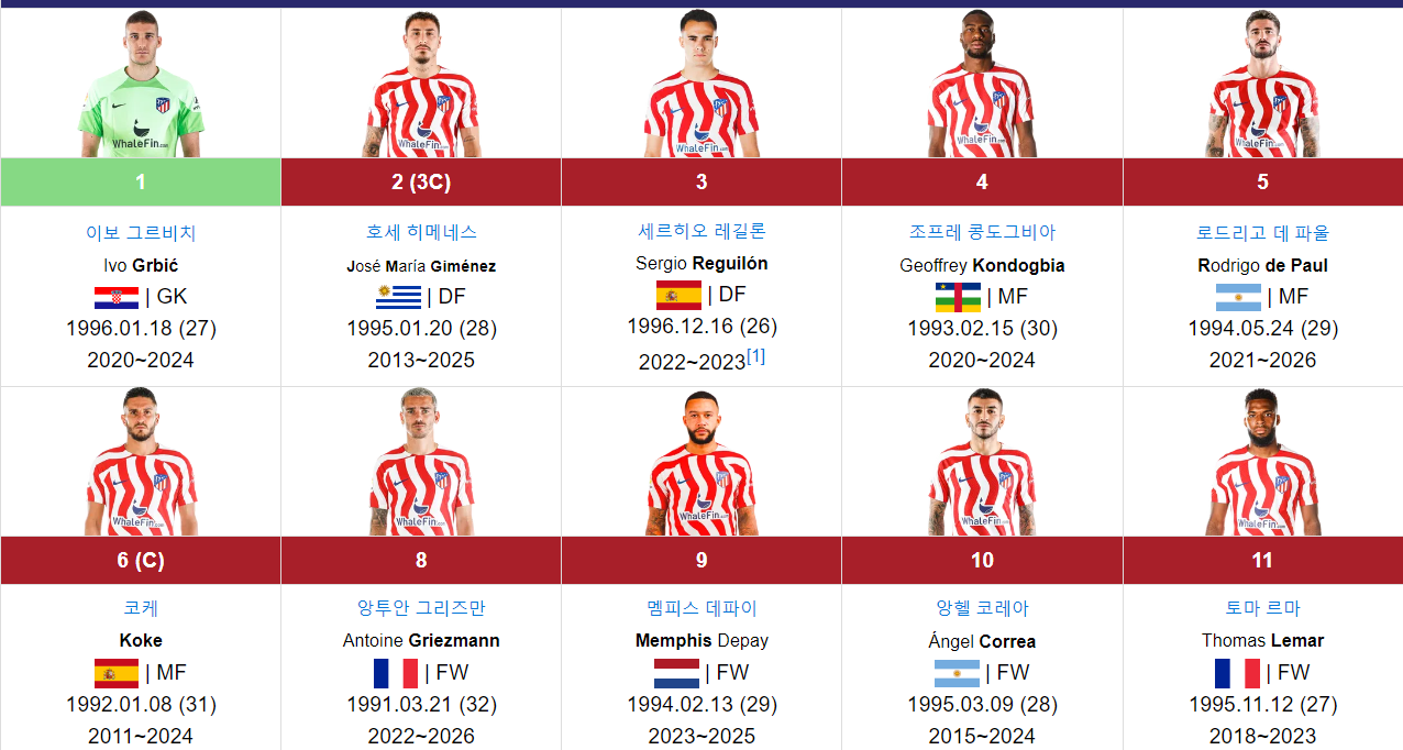 현재 디에고 시메오네 감독이 지휘를 하고 있습니다. 대표적인 선수로는 모라타, 요렌테, 코케 등이 있으며, 프랑스 국가대표인 앙투안 그리즈만, 데파이 등의 선수가 있습니다.