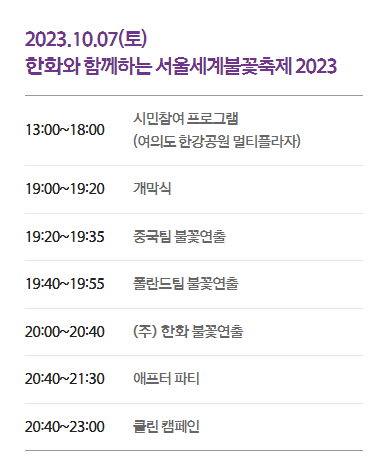 여의도 불꽃축제 2023은 10월 7일(토) 오후 1시부터 참여 프로그램으로 시작합니다. 실제 불꽃축제 시간은 저녁 7시부터 8시 40분까지입니다. 아래에서 세부 프로그램을 미리 챙겨보시고 알아두시면 좋겠습니다.